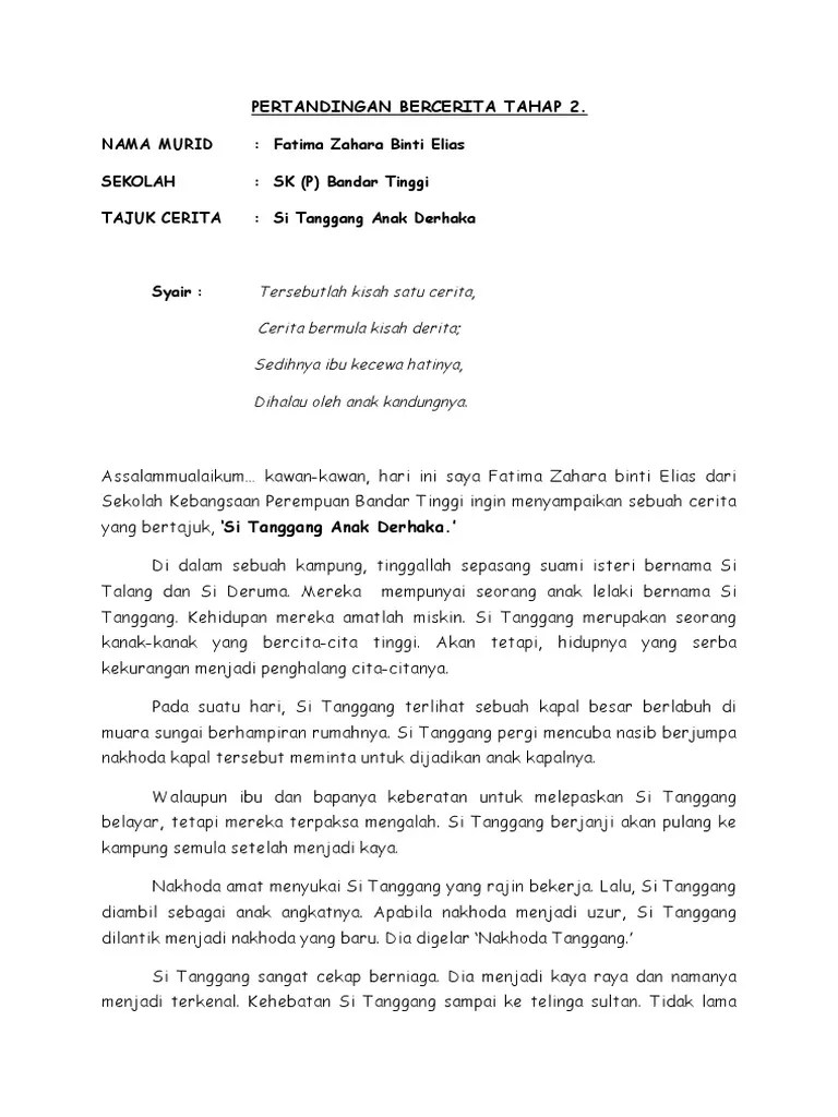 Skrip cerita tahap 1 "si tanggang anak derhaka". Teks cerita pertandingan bercerita bm sk datuk akhir zaman, 71200 rantau. Skrip cerita tahap 1 si tanggang anak derhaka hei perempuan tua jangan engkau pandai pandai mengaku dirimu itu ibuku student quotes. Teks cerita pertandingan bercerita bahasa melayu tahap 1. Maka tamatlah riwayat arnab yang mempunyai gigi yang cantik tetapi pendek akal itu. Pengawal, halau perempuan tua ini, hamba benci melihatnya! Begitulah kesombongan dan keangkuhan si tanggang terhadap ibunya dalam kisah . Pertandingan bercerita bahasa melayu tahap 2. Teks pertandingan bercerita tahap 2 tajuk cerita :